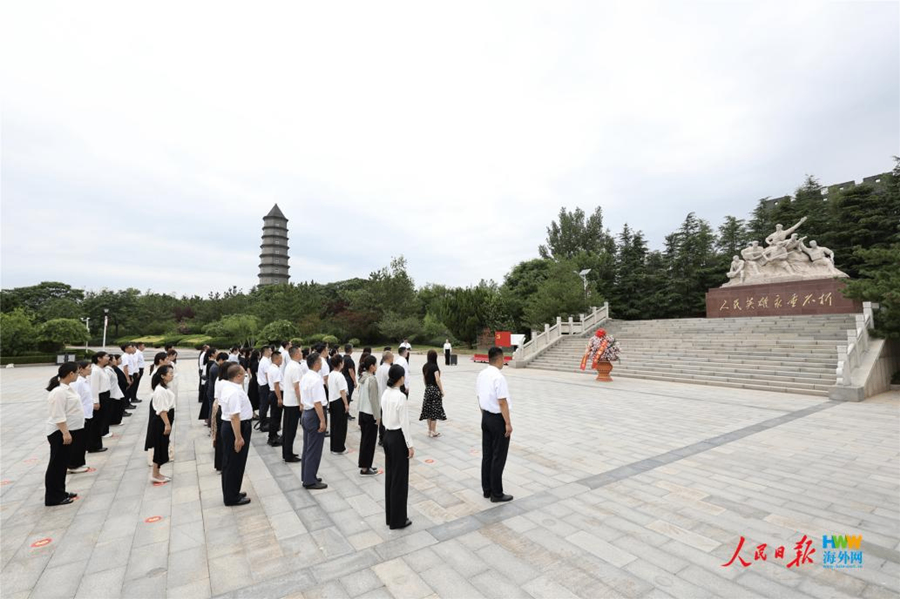 7月15日,参赛选手前往渤海革命老区纪念园向人民英雄敬献花篮。海外网 谢明 摄